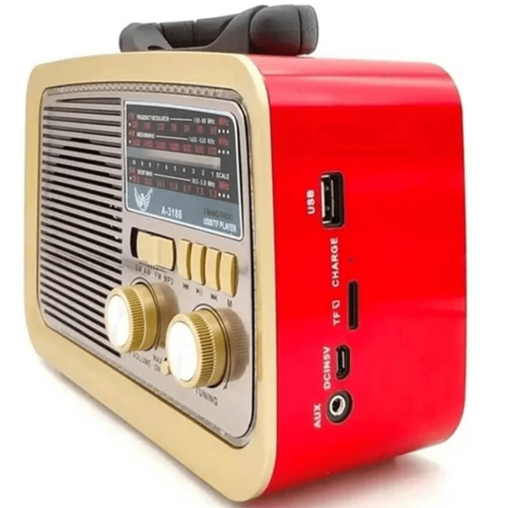 Rádio digital portátil com conexão Bluetooth para transmitir músicas.
